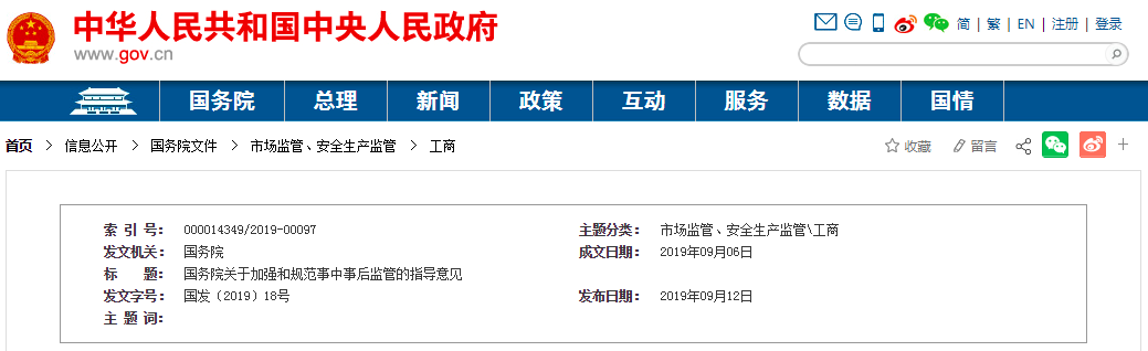 近日,国务院印发《关于加强和规范事中事后监管的指导意见》(以下简称《意见》)。《意见》指出,要坚持以习近平新时代中国特色社会主义思想为指导,持续深化“放管服”改革,坚持放管结合、并重,把更多行政资源从事前审批转到加强事中事后监管上来,加快构建权责明确、公平公正、公开透明、简约高效的事中事后监管体系,形成市场自律、政府监管、社会监督互为支撑的协同监管格局,切实管出公平、管出效率、管出活力,促进提高市场主体竞争力和市场效率,推动经济社会持续健康发展。