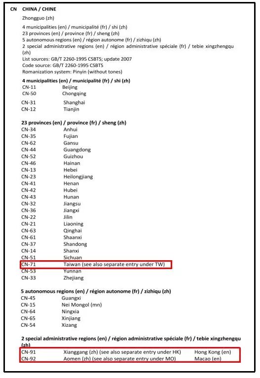 可见ISO3166-1中将台湾作为中国的一个省,香港和澳门作为中国的两个特别行政区,并分别赋予不同的代码。 ISO3166-2将涉及中国的直辖市、省、自治区和特别行政区的赋予代码,具体见以下截图。 从以上可以看出,无论是ISO3166-1,还是ISO3166-2,ISO始终坚持一个中国原则。